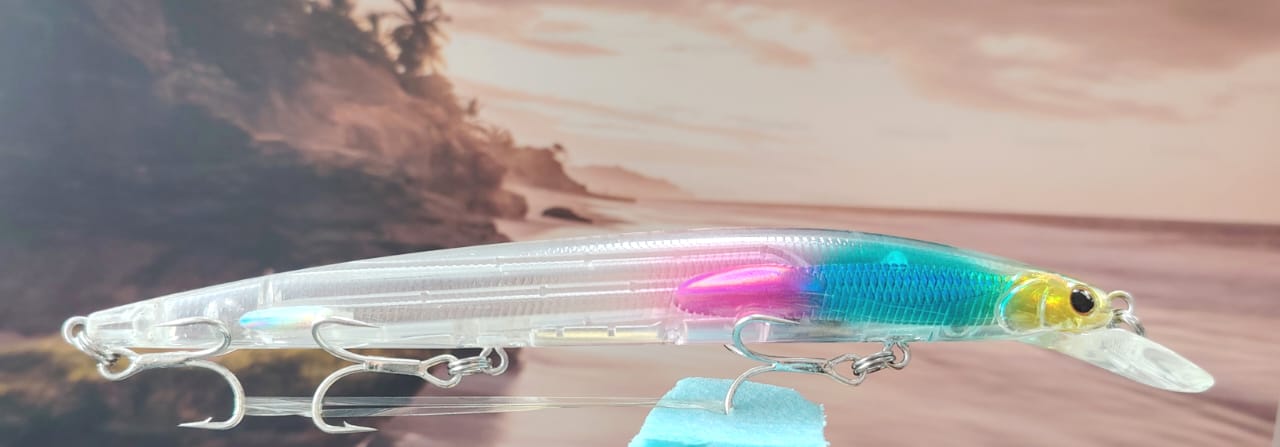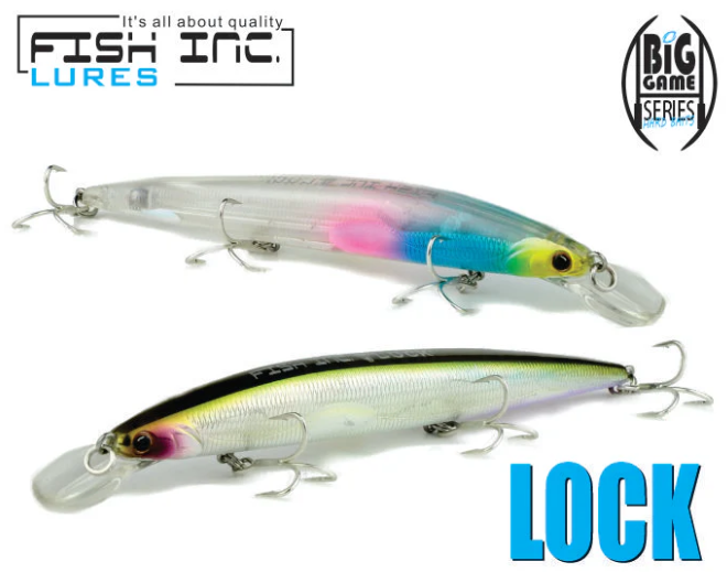 The Lock is a long jerk bait that imitates long slender bait fish. The Lock is a versatile bait that can be used to target a wide variety of game fish species. It can be used from both the shore and off a boat. Works best with a “jerk, jerk, pause” retrieve. The Lock also has a weight transfer system that allows it to be cast a long way with ease.